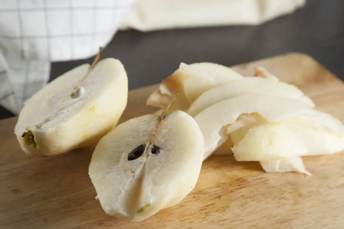 Груши очистите от кожуры и нарежьте тонкими ломтиками, полейте грушу лимонным соком.