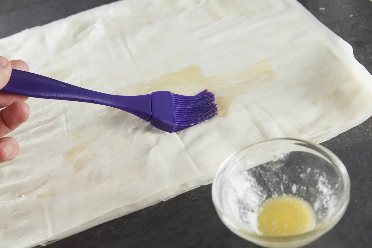 Растопите сливочное масло, разогрейте духовку до 210С. Листы фило разверните, тщательно смажьте каждый сливочным маслом, сложите листы в две стопки.