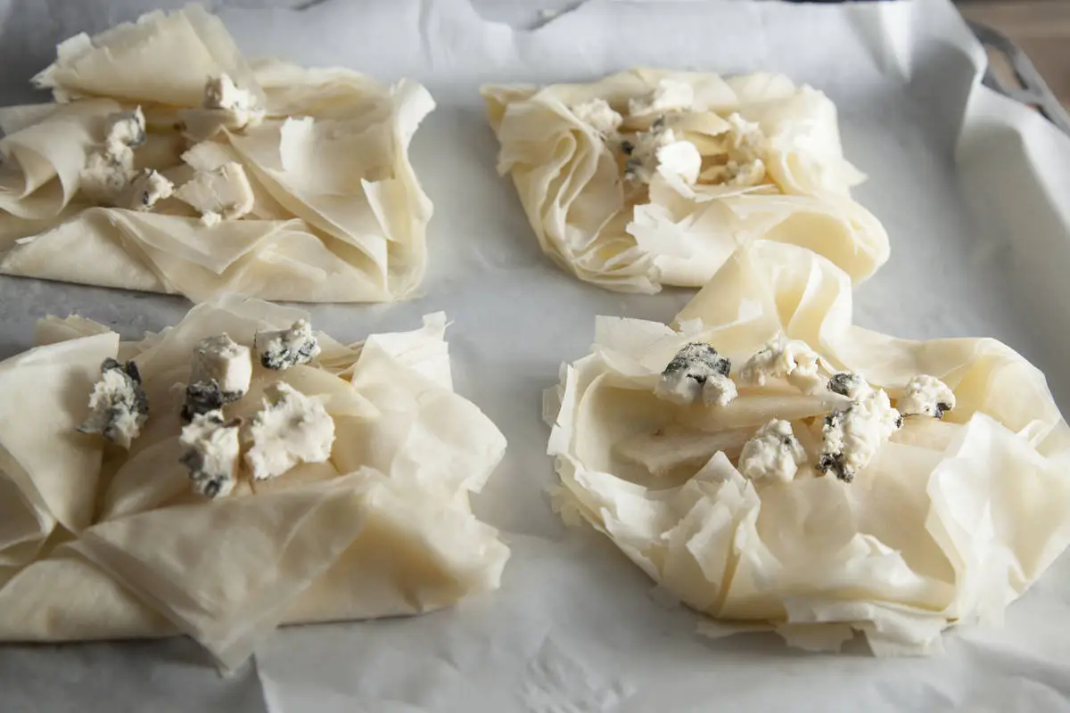 Пикантный сыр и сладкая груша — идеальное сочетание, а орешки и тесто фило добавляют хруста этой закуске. Выбирайте сочные и не слишком твердые груши, которые быстро приготовятся.