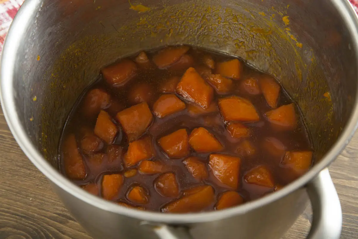 Тыкву нарежьте небольшими кусочками, засыпьте сахаром в кастрюльке с толстым дном и оставьте на 5-10 минут, затем положите кусочек масла и тушите под крышкой, периодически помешивая, до мягкости тыквы. Готовую тыкву измельчите блендером в пюре.