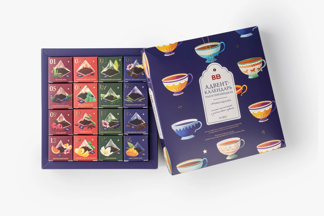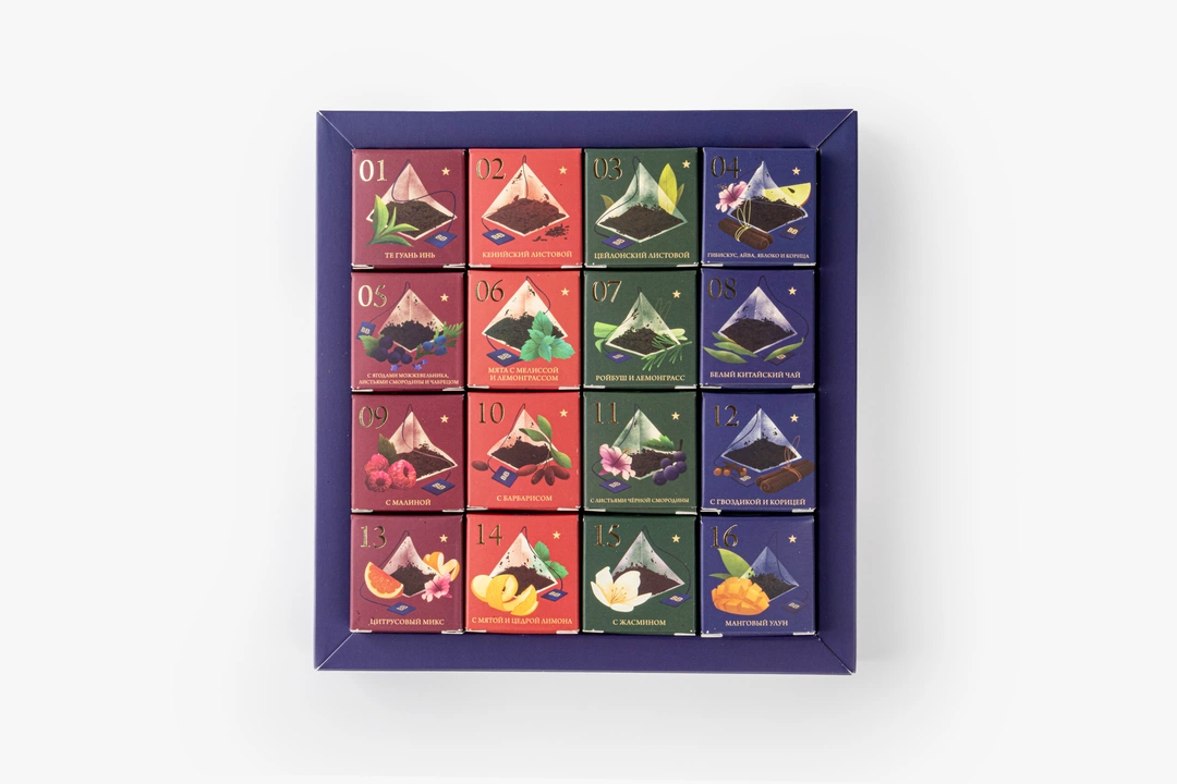 Этот новогодний адвент-календарь объединяет 16 сортов чая в пирамидках — от классических улунов и кенийских чёрных чаёв до фруктовых и пряных композиций. Здесь найдётся зелёный чай с мятой и лимонной цедрой для бодрости, чёрный с малиной для уютных вечеров, ройбуш с лемонграссом для расслабления и белый чай «Бай Му Дань» для особых моментов. Каждый день — новый вкус: цитрусовый микс, корица с гвоздикой, ягодные и травяные комбинации. Пирамидки удобно заваривать, они сохраняют аромат и насыщенность. Такой календарь превращает ожидание праздника в приятный ежедневный ритуал и помогает найти свой любимый вкус.