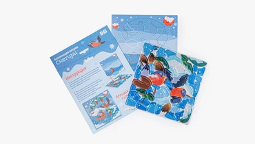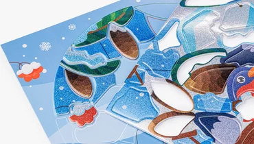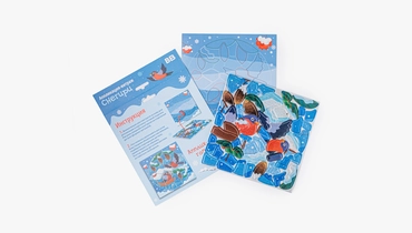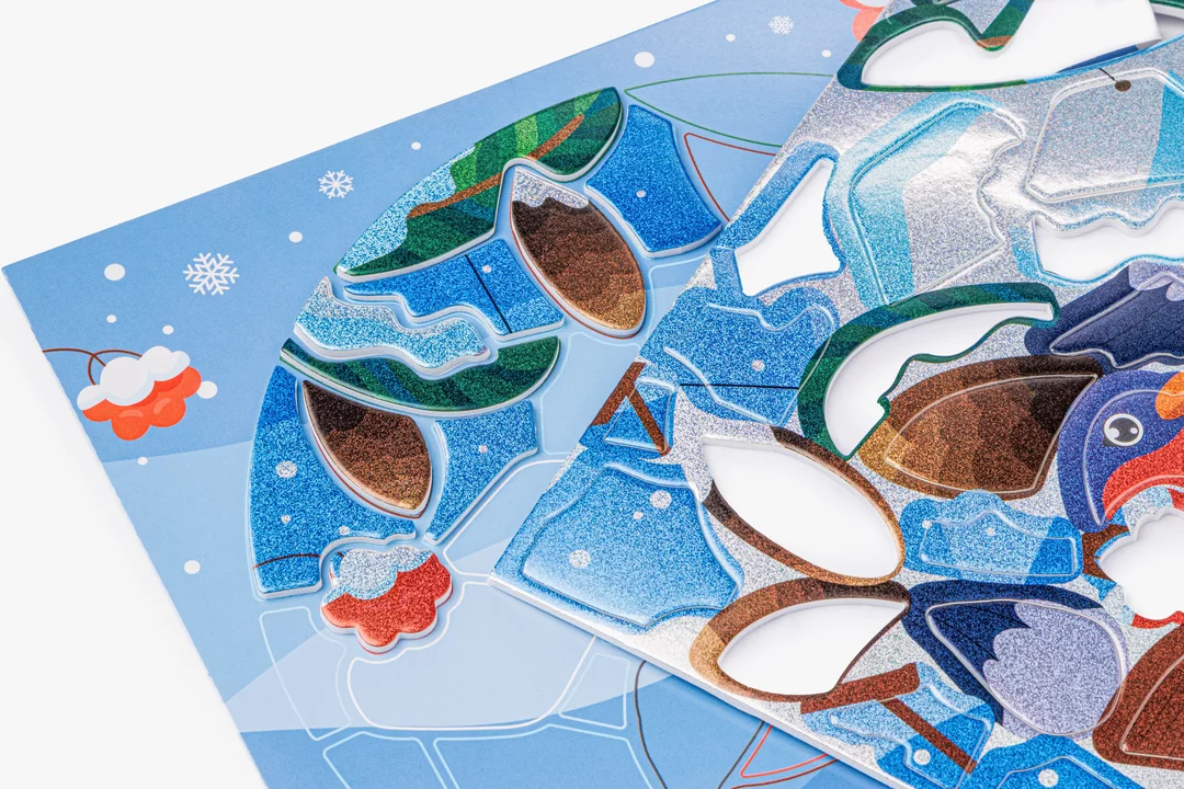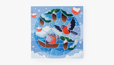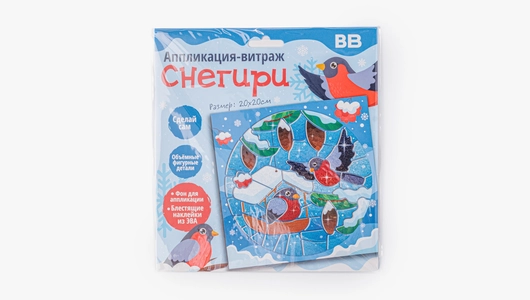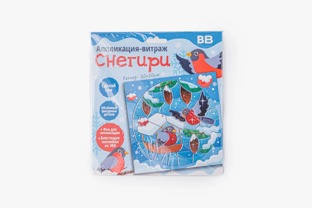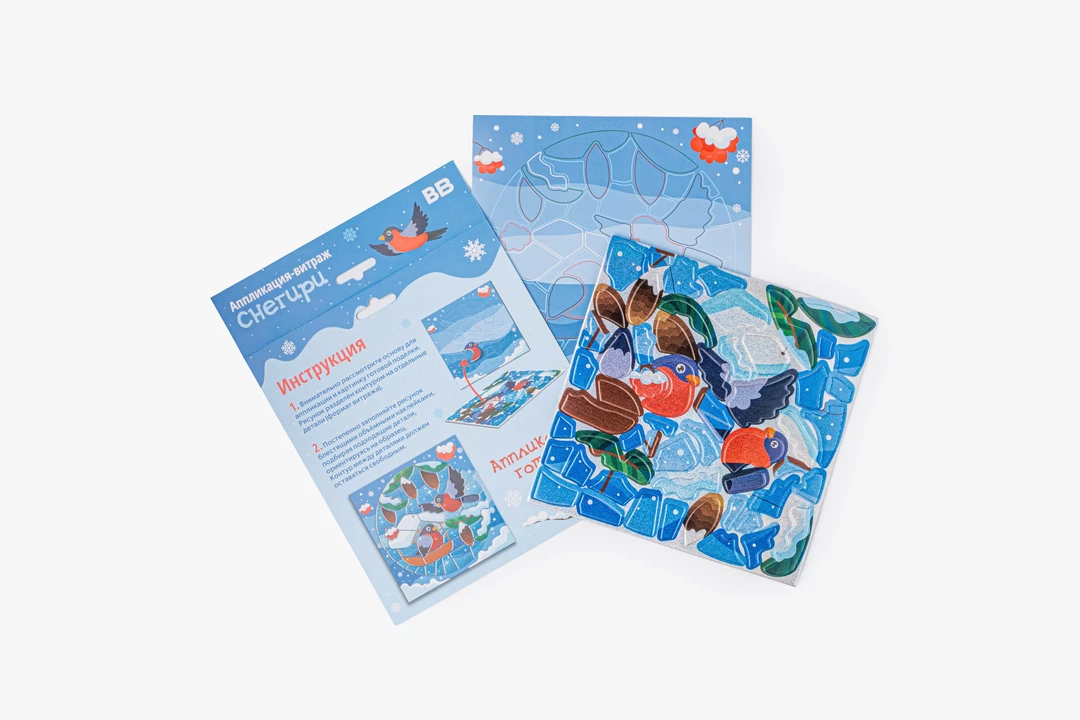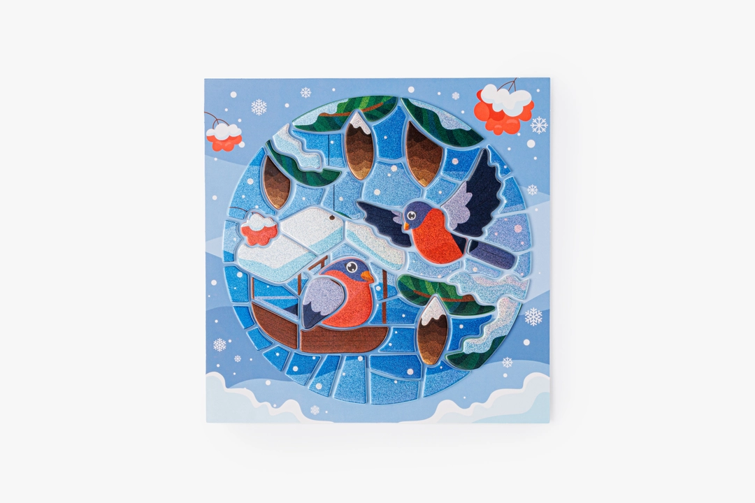 Яркая аппликация-витраж с зимним сюжетом, где из отдельных деталей постепенно собирается картинка со снегирями. Ребёнок прикрепляет элементы с клеевым слоем и фольгированным эффектом на картонный фон, заполняя форму шаг за шагом и наблюдая, как изображение становится цельным. Детали удобно отделяются от защитного слоя и хорошо фиксируются, поэтому процесс получается понятным и аккуратным. Такой формат подходит для спокойного творческого занятия, помогает сосредоточиться и учит работать с мелкими элементами. Подходит для детей от 3 лет.