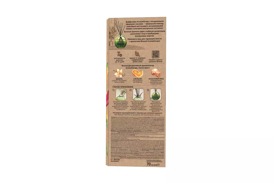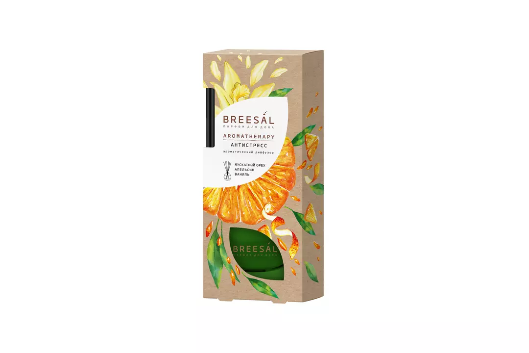 Диффузор ароматический с натуральными эфирными маслами Aromatherapy от Breesal поможет устроить сеанс ароматерапии и использовать ее целительные свойства прямо у вас дома. Просто выберите свой ароматизатор для дома – тонизирующий, расслабляющий или пробуждающий чувства – и позвольте ему творить чудеса! «Антистресс» с натуральным эфирным маслом апельсина, ванилью и мускатным орехом настроят на позитивную волну, создаст ощущение тепла и уюта, поддержит душевные силы. Чтобы эфирные масла для дома раскрыли все свои свойства, просто поместите палочки во флакон с ароматической жидкостью и уже через несколько часов они наполнят комнату своей энергией, который будет вдохновлять вас до 45 дней. Премиальная упаковка аромадиффузора – стильный флакон изумрудного цвета, чёрные палочки из полиэфира, коробка из крафтового картона – делают ароматический диффузор Aromatherapy отличным подарком и стильным предметом интерьера. Дарите гармонию себе и тем, кого вы любите! Россия