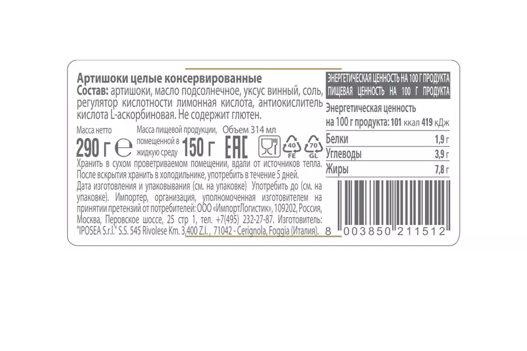 Артишоки целые в масле И.П.О.С.Е.А.идеальны для приготовления супов, запеканок, овощных салатов, соусов для пасты. Основные направления деятельности компании: производство артишоков, каперсов, овощных смесей, фасоли, сушеных томатов и грибов. Масса чистого продукта-150г