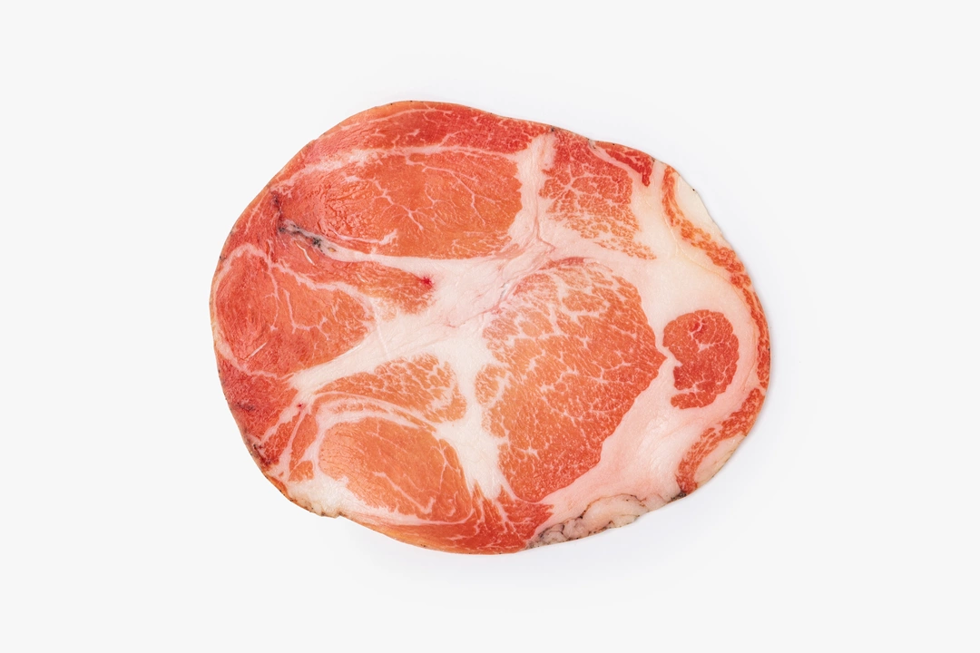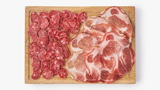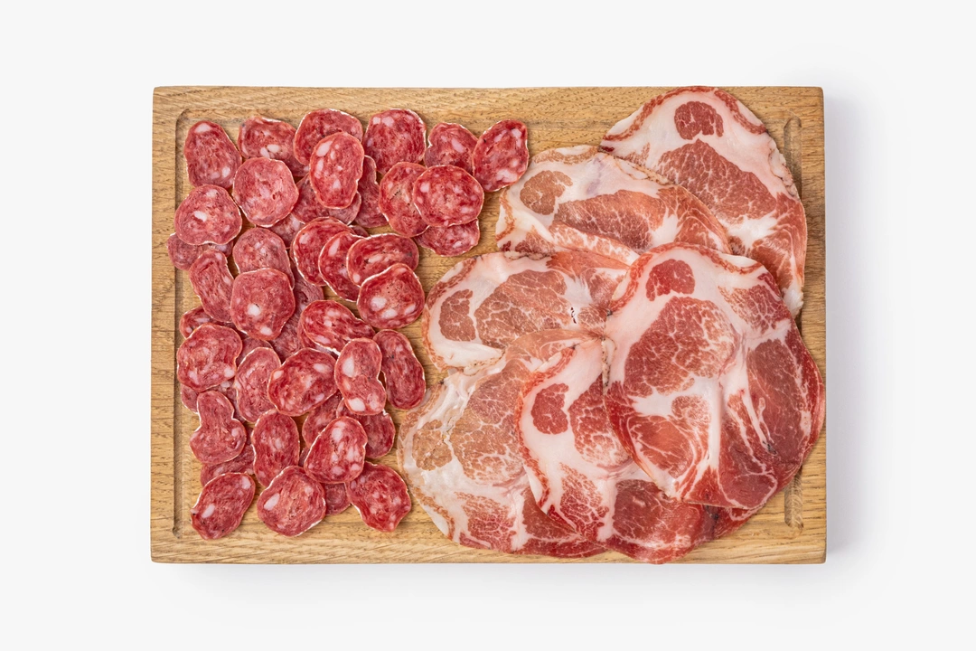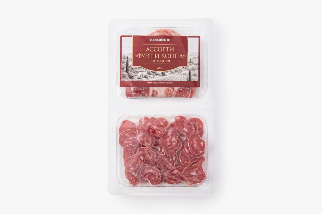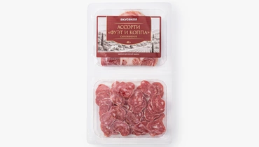 Ассорти из двух видов сыровяленой свинины. Фуэт готовят из свиного окорока со шпиком и специями, поэтому ломтики получаются более плотными и ароматными. Коппа из свиной шеи более нежная, с мягким вкусом и тонкими перечными нотками. Нарезка подходит для мясной тарелки, бутербродов или лёгких закусок. Аккуратные ломтики удобно выложить на блюдо, дополнив подачу оливками или сыром