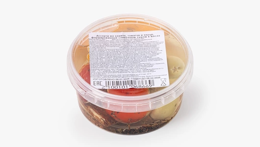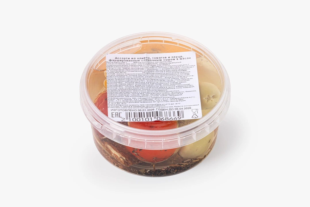 В этом ассорти собраны три вида закусок в масле: томаты сушёные, оливки без косточек и маринованные перцы. Каждый ингредиент фарширован сливочным сыром с прованскими травами — сырная начинка добавляет нежность и сливочный акцент. Подсолнечное масло мягко объединяет вкусы, подчёркивая натуральную кислинку томатов, солоноватость оливок и яркий вкус перцев. Подойдёт для фуршетного стола или сырной тарелки.