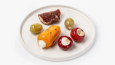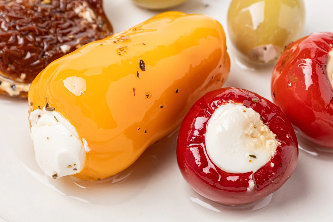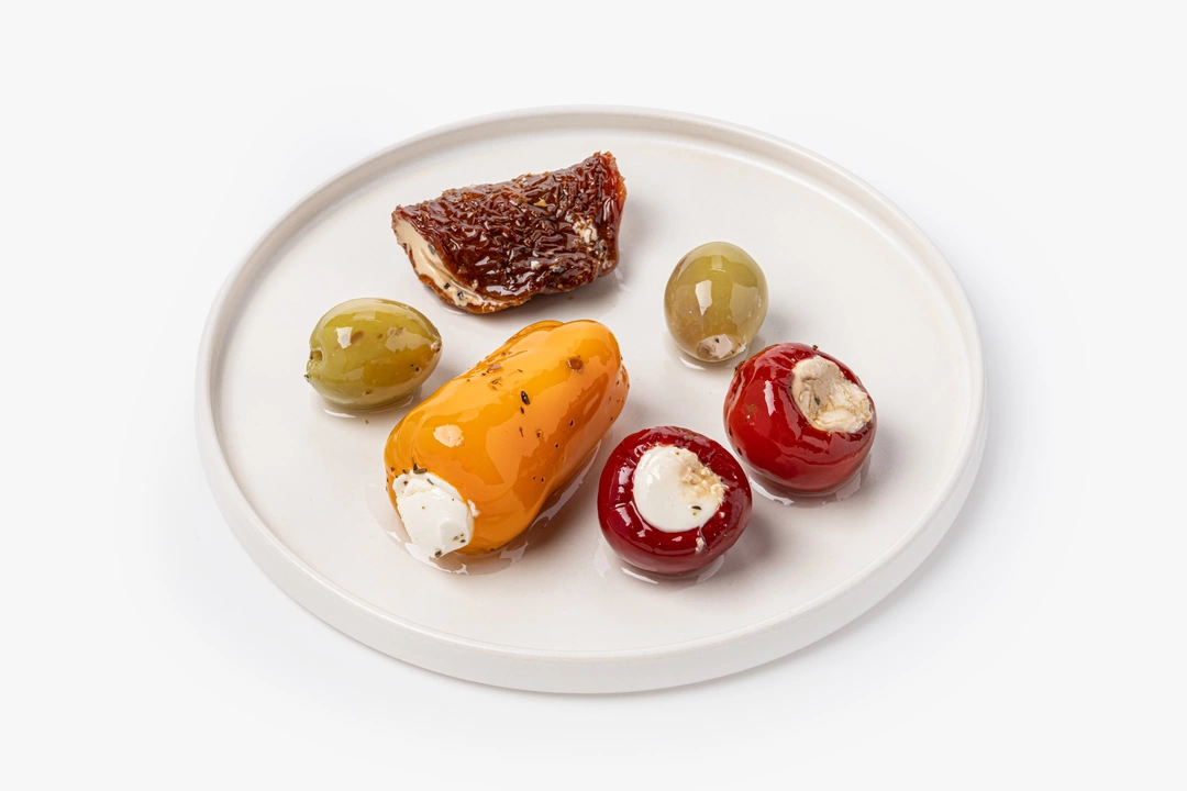 Ассорти из оливок, томатов и перца, фаршированные сливочным сыром в масле