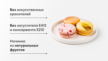 пирожное «Макарон «Мандарин» (сахар, мука миндальная, пастеризованный яичный белок, шоколад белый (сахар, какао-масло, сухое цельное молоко, эмульгатор – лецитины (соевый), натуральный ароматизатор – ваниль), шоколад белый с карамелью (какао-масло, сахар, молочный карамелизированный порошок (сухое обезжиренное молоко, сухая молочная сыворотка, сахар, молочный жир, натуральный ароматизатор – ваниль)), вода питьевая, пюре фруктовое «Мандарин» (пюре из мандарина, сахар), пюре фруктовое «Лимон» (пюре из лимона, сахар), пюре фруктовое «Юдзу» (пюре из юдзу), масло сладко-сливочное несолёное м. д. ж. 82,5 %, сироп глюкозы (из кукурузы, пшеницы), влагоудерживающий агент – сорбит, декстроза, эмульгатор – лецитины (соевый), краситель – каротины (бета-каротин), экстракт из сафлора, экстракт генипы); пирожное «Макарон «Солёная карамель» (сахар, мука миндальная, пастеризованный яичный белок, белый шоколад (сахар, какао-масло, сухое цельное молоко, эмульгатор – лецитины (соевый), натуральный ароматизатор – ваниль), шоколад белый с карамелью (какао-масло, сахар, молочный карамелизированный порошок (сухое обезжиренное молоко, сухая молочная сыворотка, сахар, молочный жир, натуральный ароматизатор – ваниль), сухое цельное молоко, карамелизованный сахар, лактоза (молоко), эмульгатор – лецитины (соевый), соль пищевая, натуральный ароматизатор – ваниль), вода питьевая, масло сладко-сливочное несолёное м. д. ж. 82,5 %, сливки питьевые ультрапастеризованные, молоко питьевое ультрапастеризованное, карамельный сироп (вода питьевая, сахар), сироп глюкозы (из пшеницы, кукурузы), декстроза, влагоудерживающий агент – сорбит, соль пищевая, красители (каротины (бета-каротин), уголь растительный, сахарный колер I простой)); пирожное «Макарон «Малина» (сахар, мука миндальная, белок яичный жидкий пастеризованный, шоколадная глазурь из какао-бобов «Руби» (сахар, какао-масло, сухое обезжиренное молоко, сухое цельное молоко, какао тёртое, эмульгатор – лецитины (соевый), регулятор кислотности – лимонная кислота, натуральный ароматизатор – ваниль), пюре фруктовое «Малина» (пюре из малины, сахар), пюре фруктовое «Клубника» (пюре из клубники, сахар), пюре фруктовое «Клюква» (пюре из клюквы, сахар), пюре фруктовое «Лимон» (пюре из лимона, сахар), вода питьевая, масло сладко-сливочное несолёное м. д. ж. 82,5 %, сироп глюкозы (из кукурузы, пшеницы), декстроза, влагоудерживающий агент – сорбит, ароматизатор натуральный «Малина», краситель – красный свекольный). Содержит сахар и подсластитель (сорбит). При чрезмерном употреблении может оказывать слабительное действие.Продукция производится на предприятии,где используются арахис, злаки, содержащие глютен, кунжут.