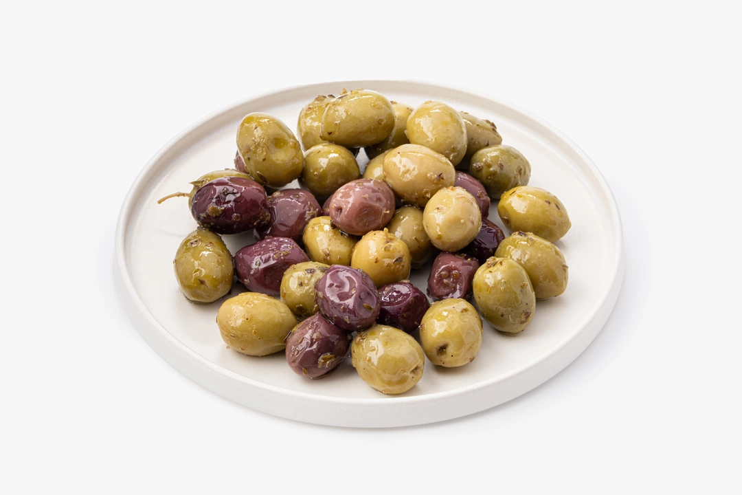 Ассорти крупных оливок сортов Халкидики и Каламата создано для ценителей гурманских закусок. Плоды обладают сочной, мясистой мякотью и душистым ароматом, в котором слышны ноты орегано и оливкового масла. Во вкусе — обволакивающая маслянистая глубина. Готовая идея для подачи с напитками и дополнения закусочных тарелок.