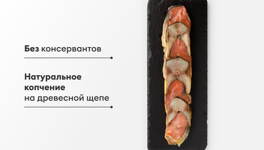 Ароматное ассорти из рыбы холодного копчения: горбуши и скумбрии. Нежная текстура и тонкий контраст вкусов: сладковатого и насыщенного рыбного. Без консервантов