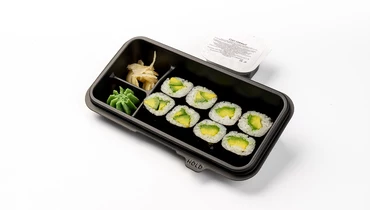Классический ролл с авокадо. Подается с соевым соусом, маринованным имбирем, васаби.