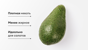 Этот несладкий фрукт уже покорил не одно сердце! Классическое авокадо по форме напоминает грушу, только ярко-зелёного цвета и с глянцевым блеском. В меру мягкая и маслянистая мякоть плода обнимает довольно крупную косточку, из которой можно вырастить свое собственное деревце! Если вы следите за питанием и балансом БЖУ, этот вид авокадо идеально дополнит вашу диету, ведь количество жиров в нем не очень высокое. Благодаря умеренной мягкости классическое авокадо можно легко порезать кубиками в салат или завернуть в роллы. Вес одного плода от 130 г