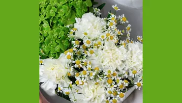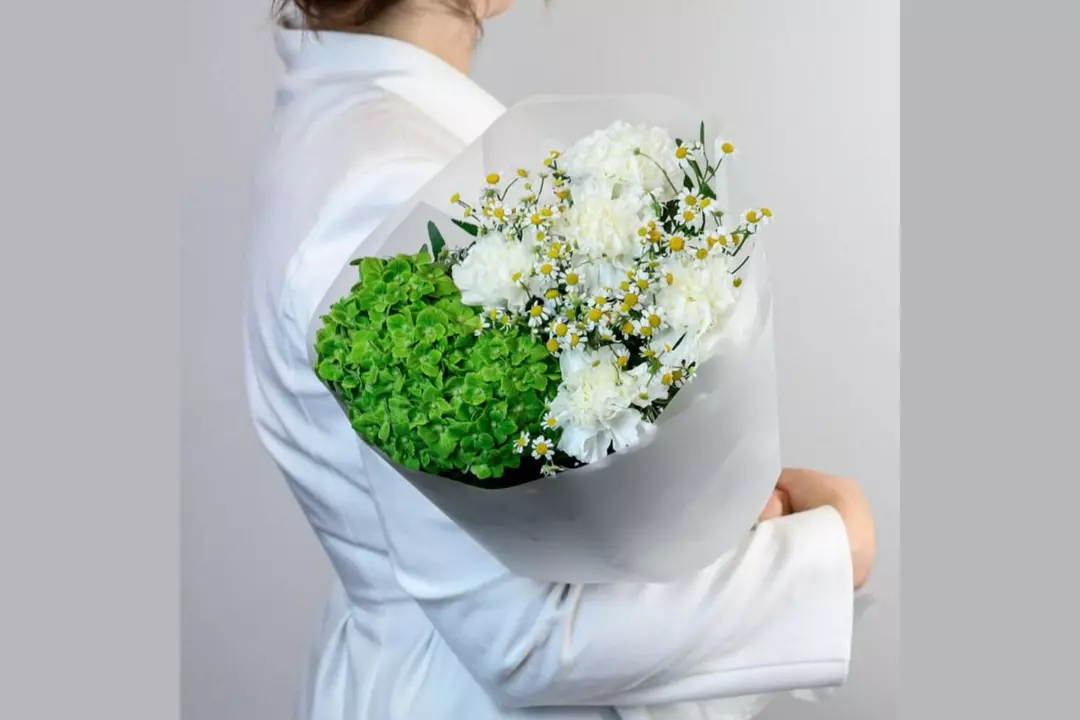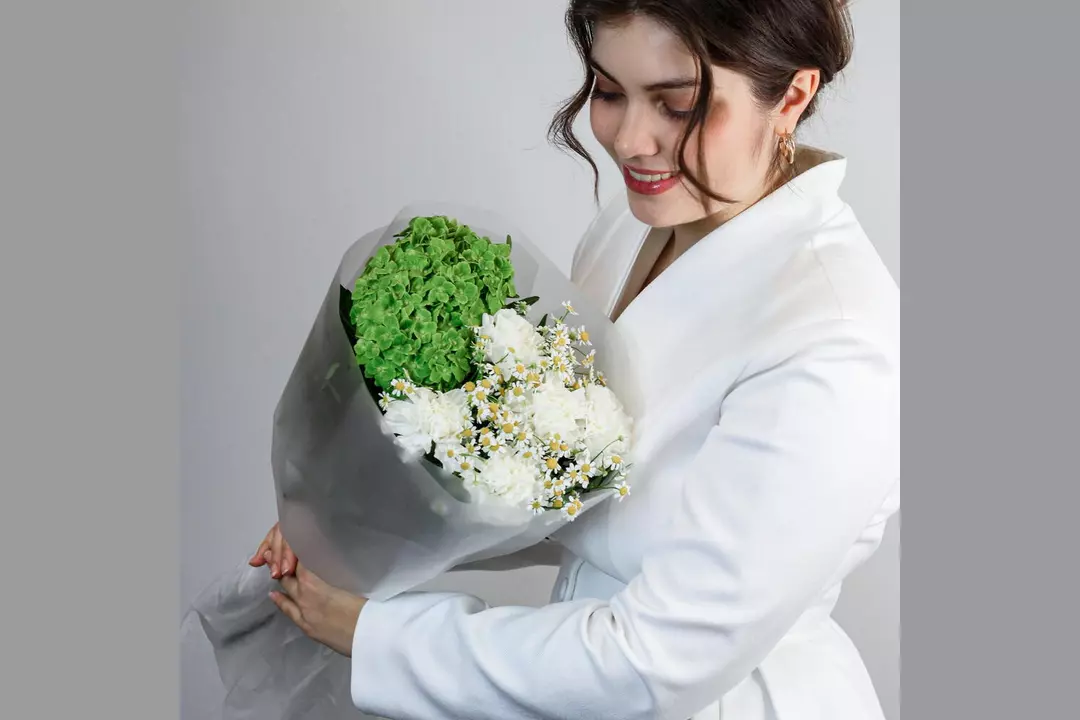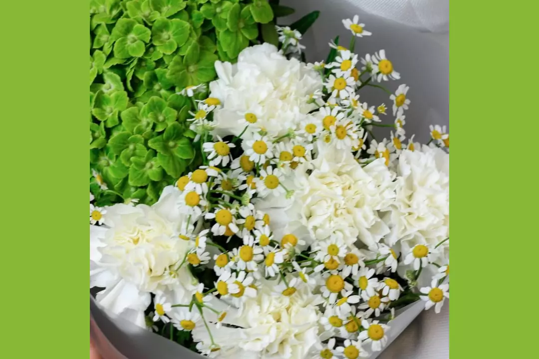 Авторский букет из гортензии, кустовой ромашки и гвоздики "Зелeное поле" FMART by flowwow