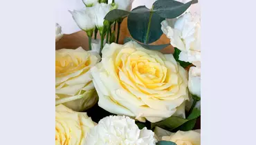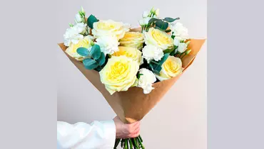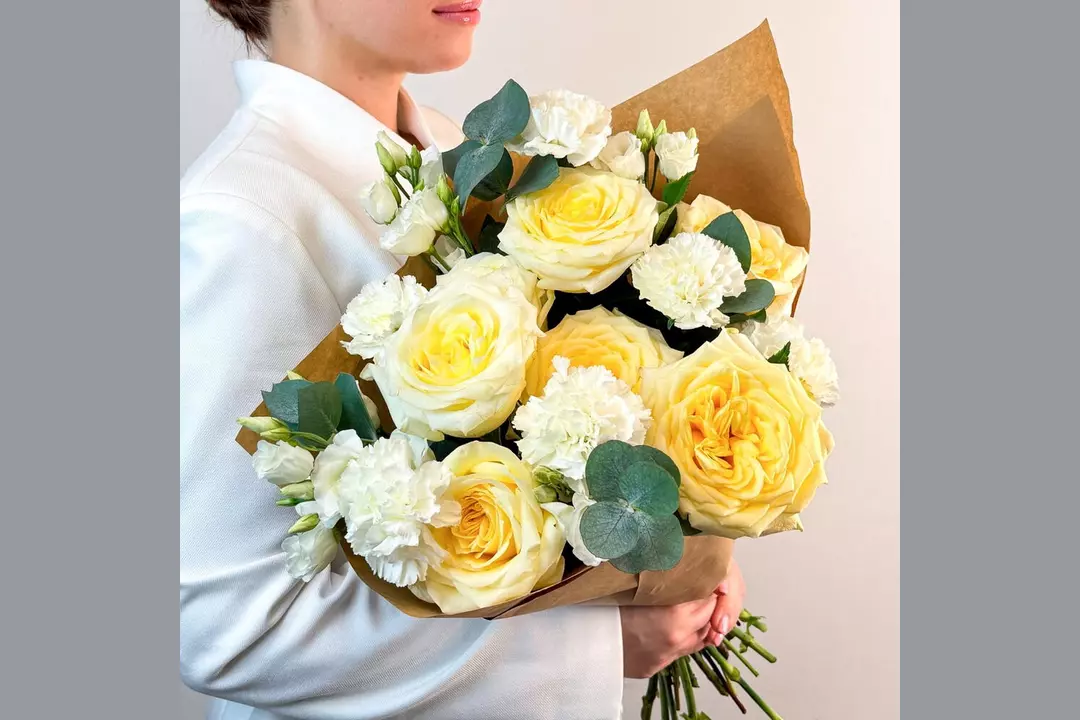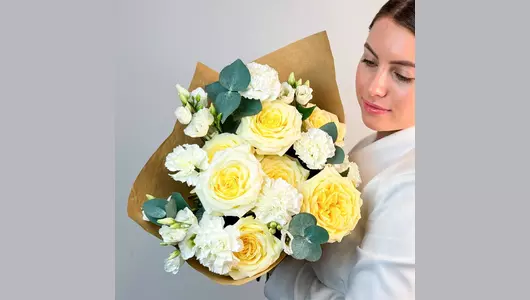 Авторский букет из кремовой розы, гвоздики и лизиантуса "Нежность в сердце" FMART by flowwow