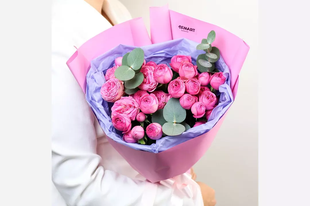 Авторский букет «Жизель» из розовых кустовых роз и эвкалипта FMART by flowwow