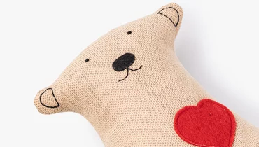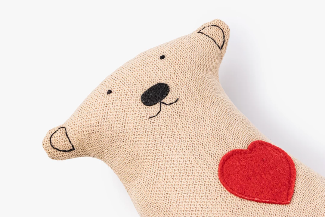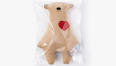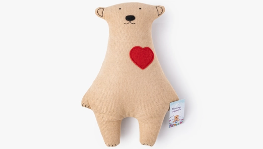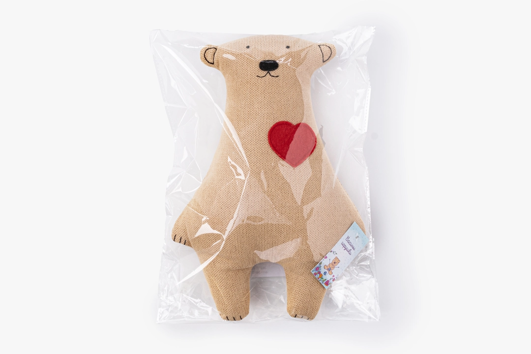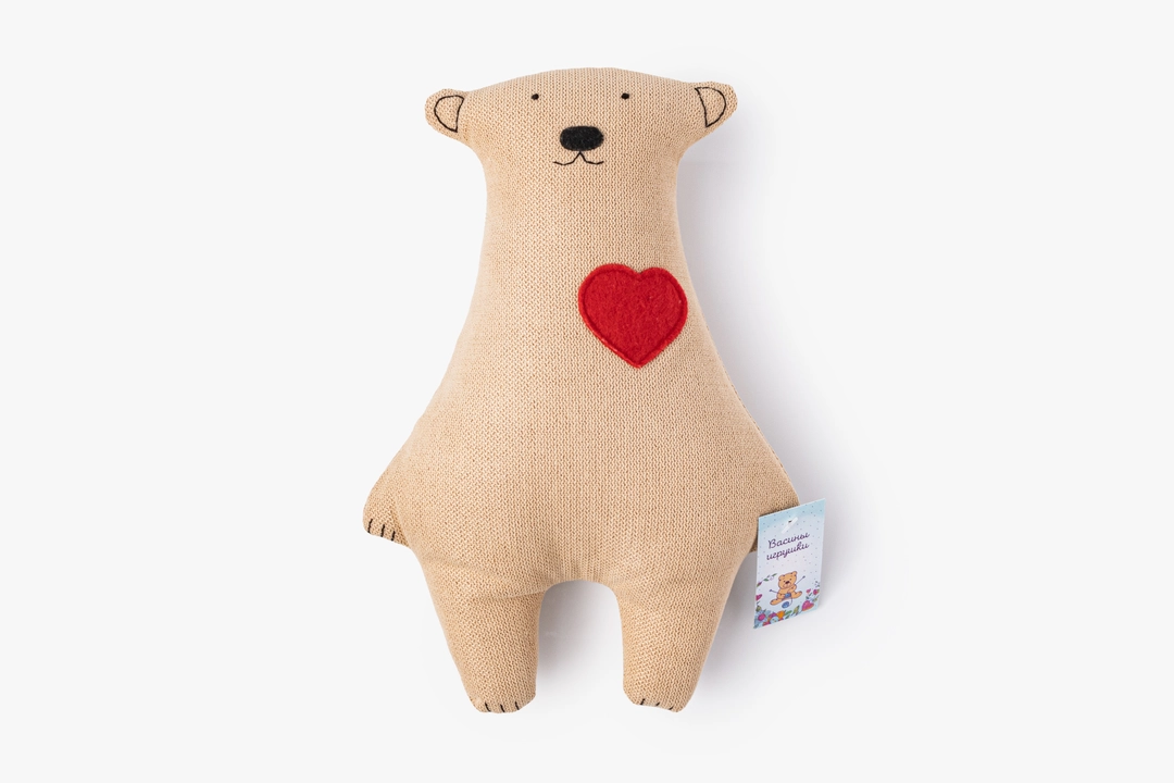 Очаровательная игрушка ручной работы в виде мишки с красным сердцем. Он мягкий, приятный на ощупь и тёплый по настроению. Медвежонок выглядит доброжелательно и немного наивно, поэтому его хочется держать в руках и рассматривать. Сшит из искусственного льна, а его сердечко — из фетра, наполнен холлофайбером. Мишка украсит детскую комнату или подарит душевное тепло в качестве подарка. Изделие выполнено в мастерской авторских работ «Васины игрушки», где создают добрые игрушки ручной работы, сохраняющие тепло рук мастера. Там трудятся десятки опытных мастеров со всей страны, в том числе люди из социально уязвимой категории граждан. Размер игрушки 27 × 19 см.