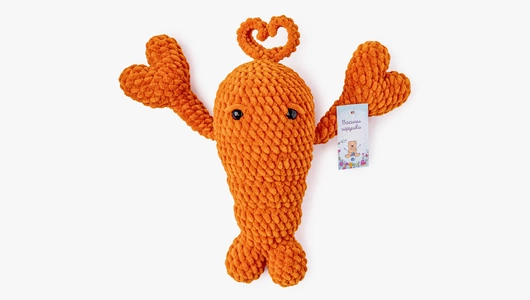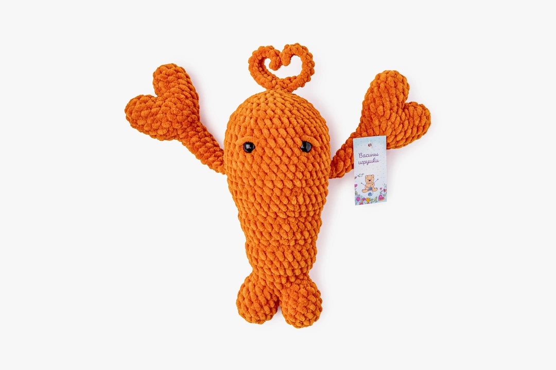 Вязаный омар с клешнями-сердечками выглядит мило и романтично. Игрушка станет украшением интерьера, её можно посадить на полку или положить на диван вместе с декоративными подушками. Мягкий микрополиэстер приятен на ощупь и не вызывает аллергических реакций. Омар может стать необычным другом для ребёнка или сувениром для взрослого коллекционера. Мастерская авторских работ «Васины игрушки» объединяет десятки мастеров со всей страны, среди которых люди из социально уязвимой категории граждан. Опытные мастера создают для детей всех возрастов исключительно добрые игрушки ручной работы, которые хранят тепло их рук.