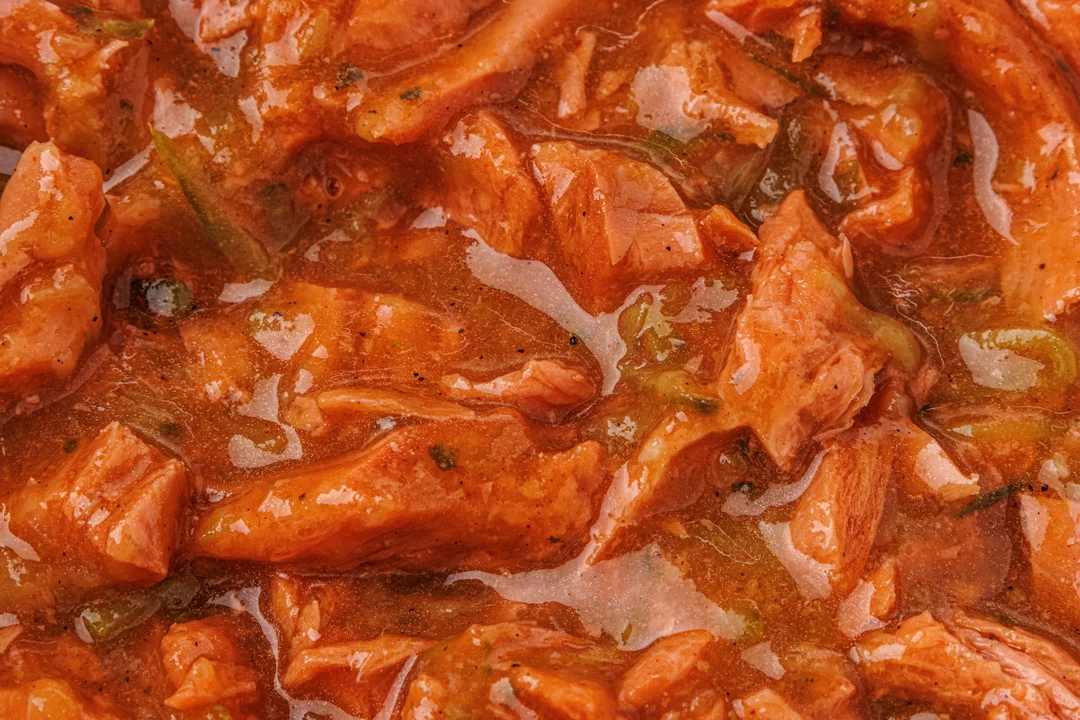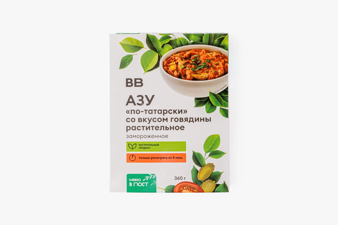 Эта вариация классического азу поможет разнообразить растительный рацион. В его основе соевый белок с добавлением глютена, который создаёт текстуру, напоминающую мясные волокна. Жареный лук придаёт сладковатый оттенок, а маринованные огурцы — характерную для азу лёгкую кислинку и хруст. Смесь специй с чесноком, паприкой и чёрным перцем добавляет пряный оттенок. Блюдо готово и бережно заморожено, его остаётся лишь разогреть любым удобным способом и подать на стол.