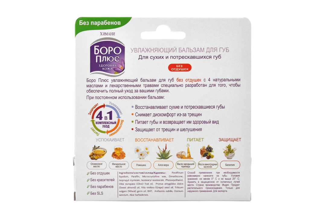 Увлажняющий бальзам для губ - комплексный уход за губами 4 в 1 Благодаря натуральным маслам и лекарственными травам в составе, бальзам не только защищает, но и восстанавливает кожу губ, питает их и предотвращает образование трещин. Базилик является одним из наиболее полезных лекарственных растений. Он предотвращает образование трещин и шелушение губ. Оливковое масло содержит в себе большое количество витаминов E и A, способствует ускорению регенерации клеток кожи и снимает дискомфорт из-за трещин. Миндальное масло — это прекрасное увлажняющее средство, которое предотвращает высыхание и шелушение кожи, а также прекрасно снимает неприятные ощущения, возникшие из-за трещин. Масло зародышей пшеницы стимулирует процесс обновления клеток, питает губы и возвращает им здоровый вид. Масло виноградных косточек обладает противовоспалительными свойствами, увлажняет и питает кожу губ, а также придает им здоровый вид. Ромашка обладает противовоспалительным и успокаивающим действием, и, к тому же, стимулирует кровообращение. Результат: восстановление, заживление, защита от внешних воздействий, питание, повышение упругости, разглаживание, смягчение, увлажнение. Страна-производитель Индия