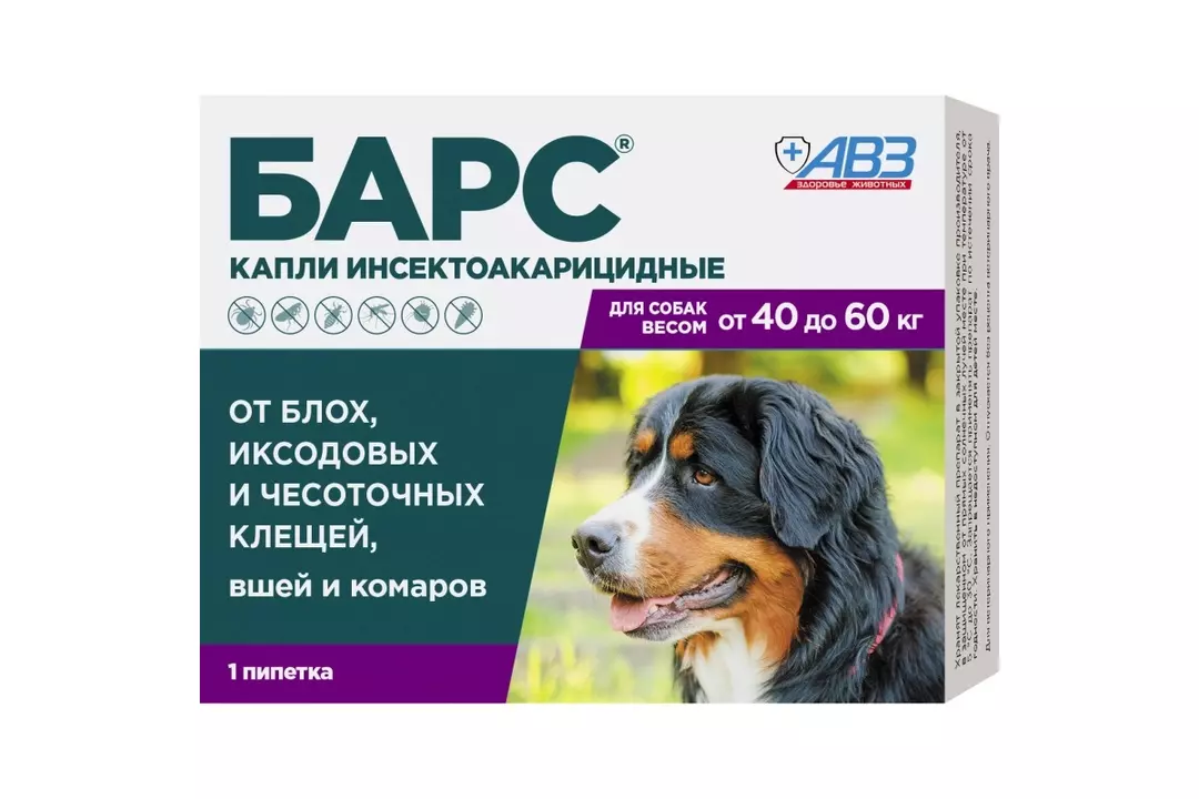 БАРС капли инсектоакарицидные для собак от 40 до 60 кг (1 пип. по 4,02 мл) (АВЗ) купить с бесплатной доставкой на дом всего за 2 часа из ВкусВилла. Также можно оформить онлайн-заявку на самовывоз и забрать собранный заказ через 30 минут. Цены, отзывы о товарах от наших покупателей, действующие акции на официальном сайте ВкусВилл.
