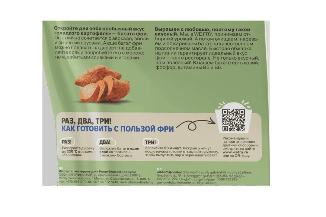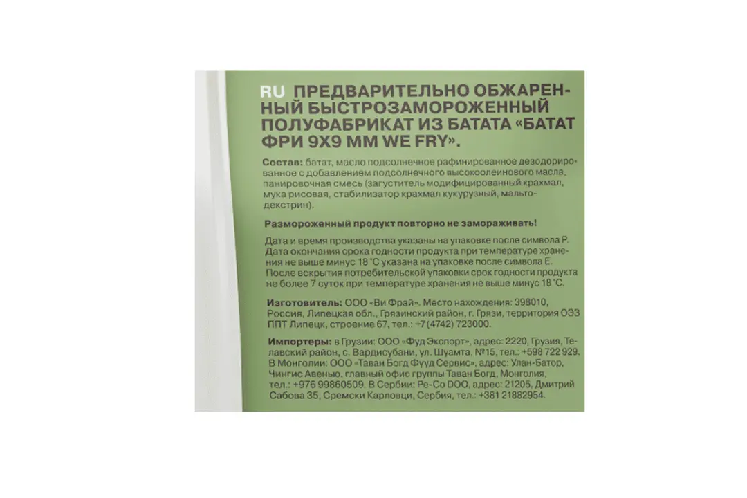 Батат гурмэ — новый изысканный фри, но не из обычного, а из «сладкого картофеля». Настоящая хрустящая соломка, к которой так и тянется рука :) Внутри — 100% радости и 100% натуральный батат, обжаренный на качественном подсолнечном масле. Специальная панировка гарантирует идеальную хрустящую корочку даже при запекании. Наш секретный рецепт: готовьте в духовке, без фритюра. 20 минут — и батат готов к столу. Ароматный и хрустящий, он отлично сочетается с авокадо, айоли и сырными соусами. А еще батат фри можно подавать на десерт: не добавляйте соль и попробуйте его с мороженым, взбитыми сливками и свежими ягодами. Страна-производитель Россия