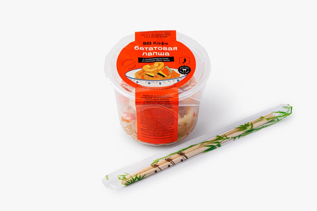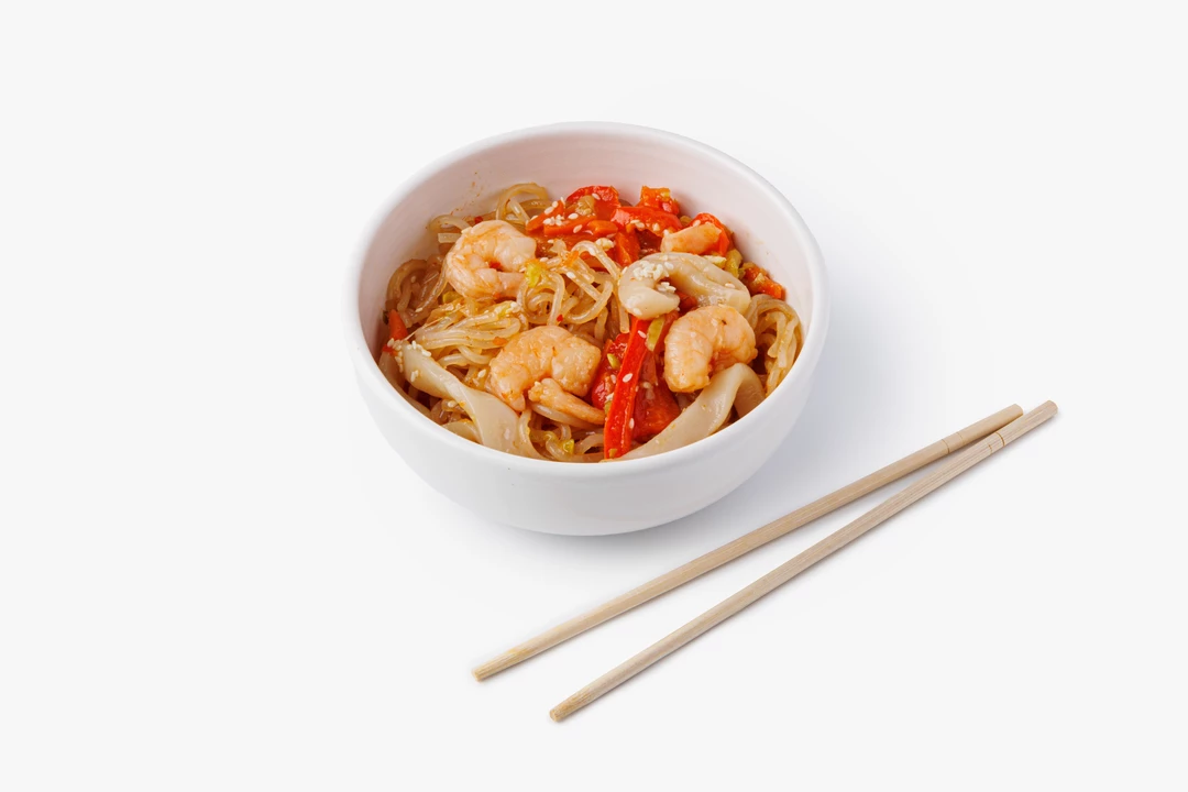 Традиционное азиатское блюдо из прозрачной бататовой лапши с креветками и кальмарами. Запечённые овощи добавляют ему едва заметную сладость и приятный хруст, а сладковато-острый соус делает умеренно пикантным. Благодаря удобному контейнеру и палочкам в наборе лапшу можно взять на обед в офис или в дорогу. Это лёгкий и сытный вариант для тех, кто любит морепродукты и хочет разнообразить свой рацион.