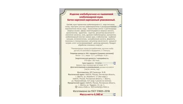 Традиционный, всеми любимый батон. Вкусный, ароматный, с нежным мякишем и золотистой корочкой, изготавливается опарным методом. Имеет приятное сочетание молочно-сливочного вкуса. Нарезан ровными тонкими ломтиками, поэтому бутерброды готовятся мгновенно. Страна производитель-Россия