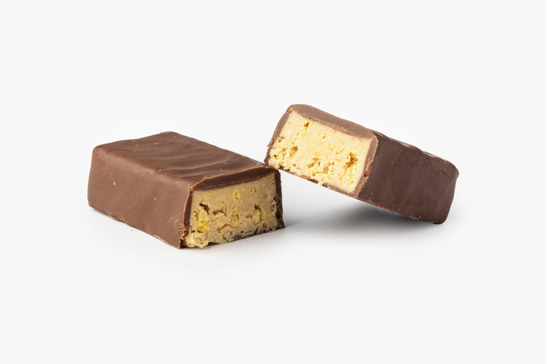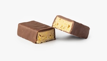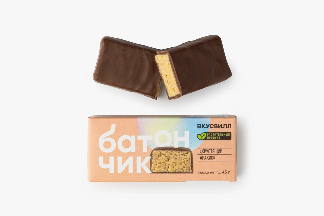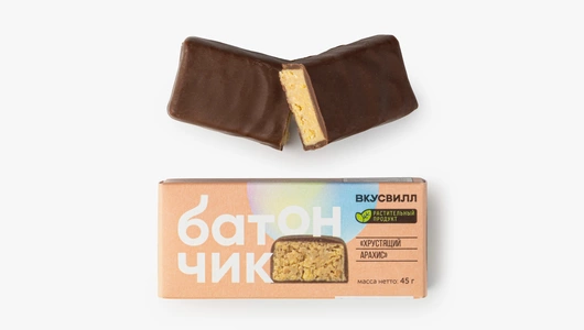 Многогранная текстура хрустящего арахиса, воздушных кукурузных хлопьев и кунжутной пасты покрыта белым и тёмным шоколадом на основе какао-масла с ванильными нотами. В составе нет молочных компонентов — вместо них используются кокосовый напиток и кешью, что делает батончик подходящим для растительного рациона. Удобен как перекус в дороге, после тренировки или когда хочется чего-то сытного к чаю.