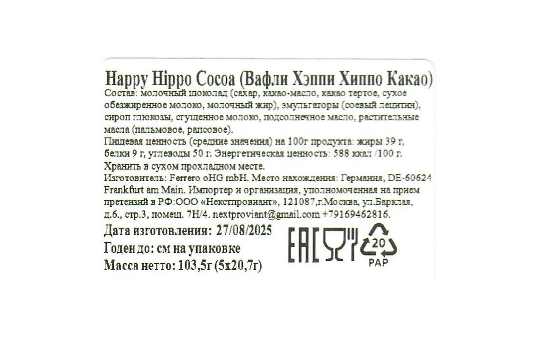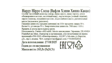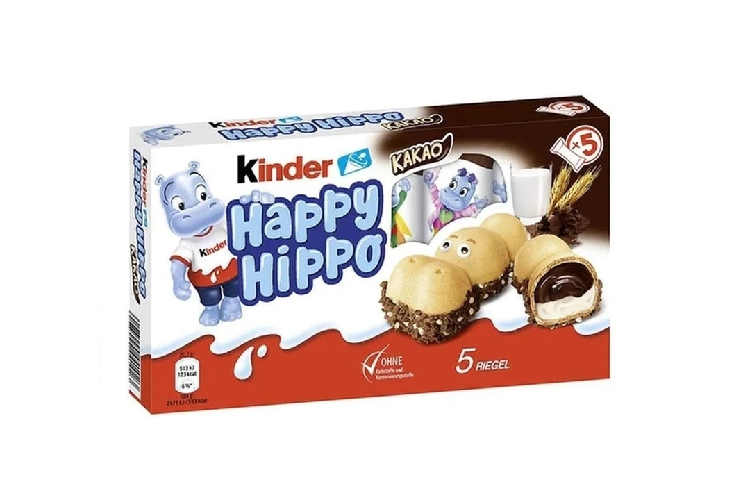 Если вы хотите побаловать своих детей, откройте для себя Kinder Happy Hippo: восхитительный вкус молока и какао в хрустящей вафле, покрытой крошкой какао. Страна производитель-Германия