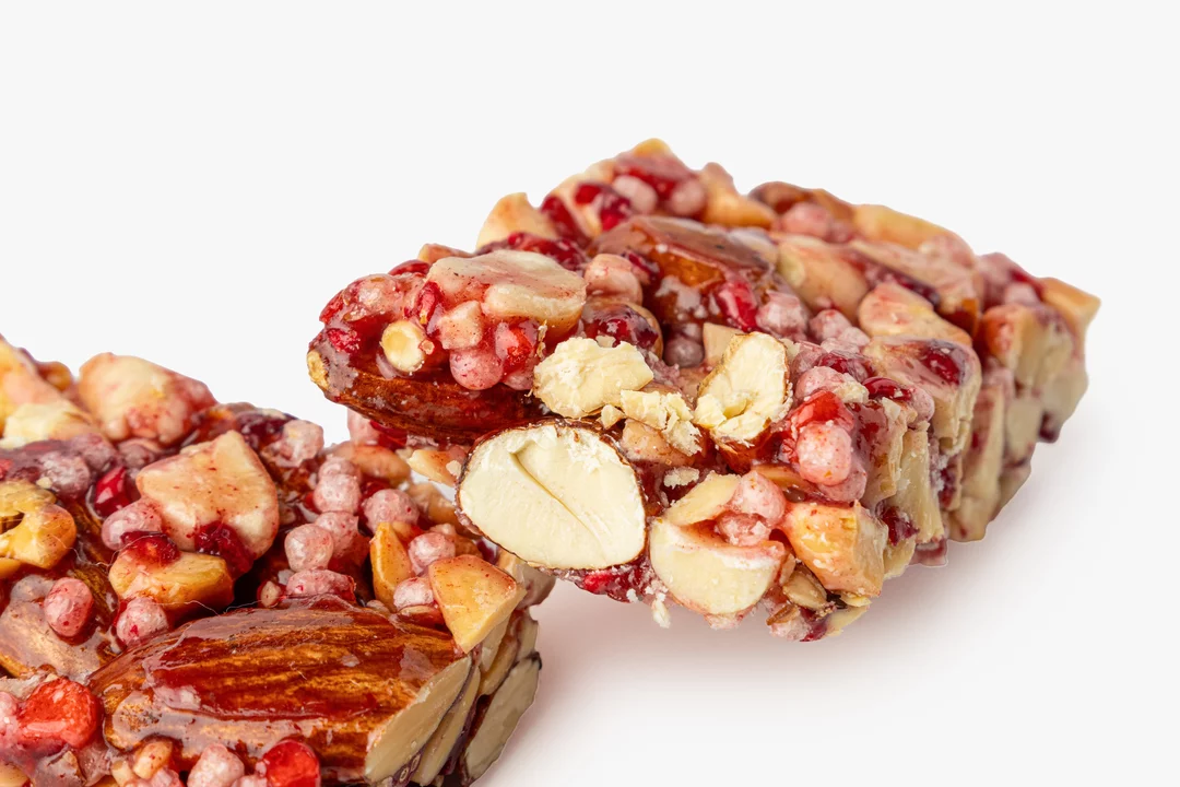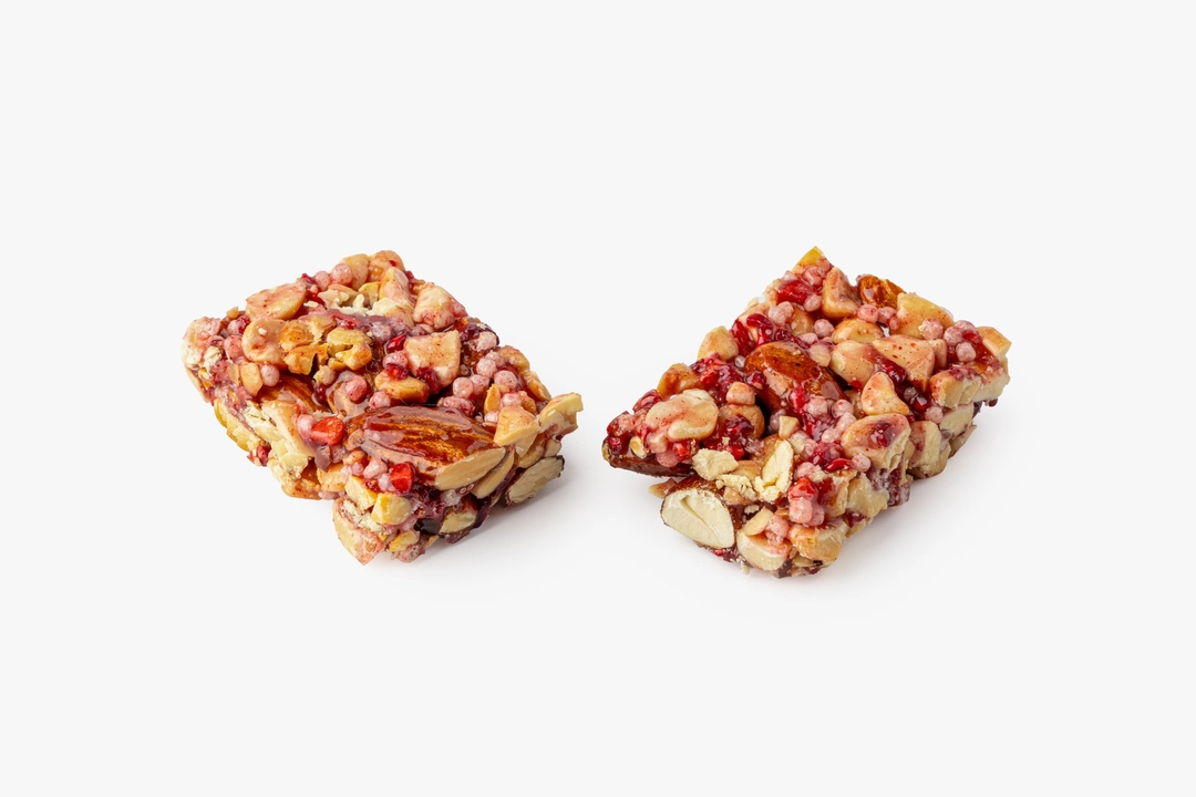 Этот батончик сочетает в себе жареный арахис, миндаль, хрустящий воздушный рис и кусочки сублимированных ягод. Карамельная патока и кокосовое масло мягко соединяют все ингредиенты, сохраняя текстуру. Ягоды дают натуральную кислинку, которая оттеняет сладость карамели. Удобный формат подходит для перекуса в дороге или в течение активного дня.