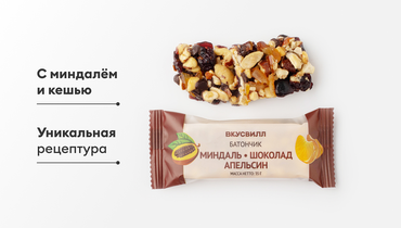 Аппетитный батончик с твёрдой грильяжной текстурой, изготовленный на основе миндаля и кешью. Он отличается многогранным, умеренно сладким вкусом, в котором ореховые ноты оттеняет пряность апельсина и благородная горчинка тёмного шоколада. Сытный, питательный и вместе с тем лёгкий, батончик прекрасно подойдёт для перекуса вне дома и станет полезным десертом к чаю и кофе.