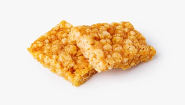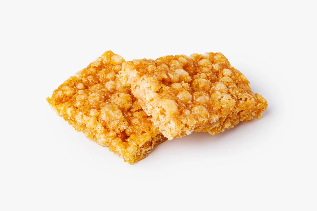 Сладкий злаковый батончик из воздушных шариков в сгущённом молоке с арахисовой пастой. Десерт получается достаточно сытным, но не приторным благодаря сбалансированному составу. У него яркий сливочный вкус с ореховыми нотами. Батончик можно взять с собой в дорогу или на работу в качестве сытного перекуса. В одной порции 126 ккал.