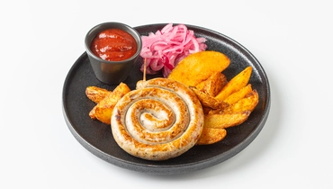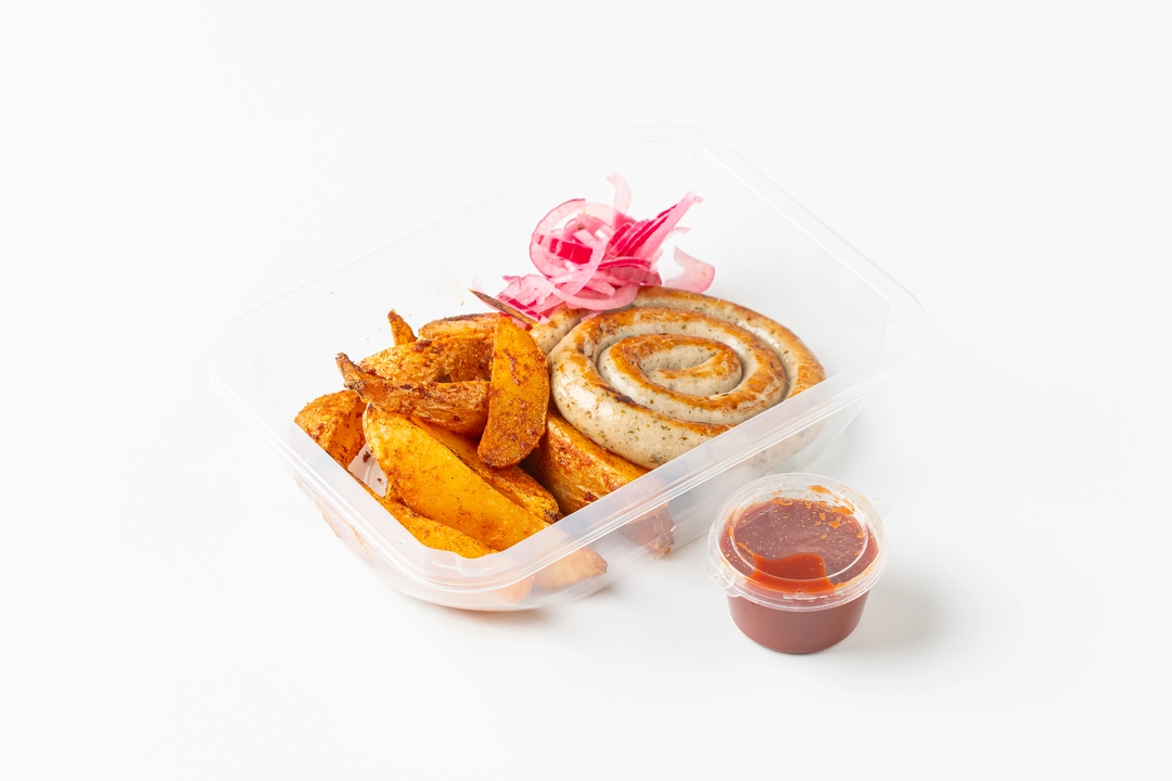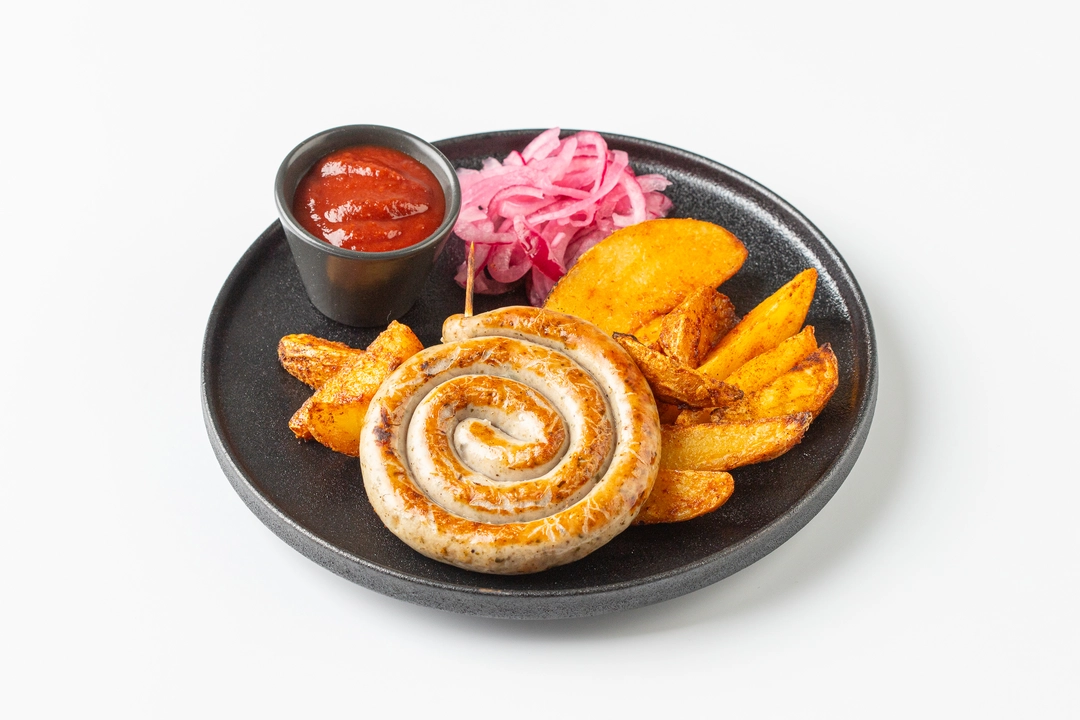 Сочная колбаска из свинины с букетом приправ имеет выразительный вкус с лёгкими пряными нотами и подаётся на деревянной шпажке. В качестве гарнира к ней предлагаем подрумяненные картофельные дольки со смесью специй. Отдельно по вкусу добавьте кольца лука и соус. Порция подходит для полноценного обеда или ужина, когда нет времени на долгую готовку, но хочется чего-нибудь сытного. Блюдо доступно для самовывоза из офлайн-точек Сгоряча и приедет к вам горячим и готовым к подаче. Его тоже можно выбрать Любимым продуктом и покупать с приятной скидкой.