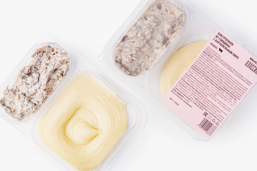 Бефстроганов из отборного мяса с картофельным пюре. Состав проверен: нет усилителей вкуса, консервантов и антибиотиков