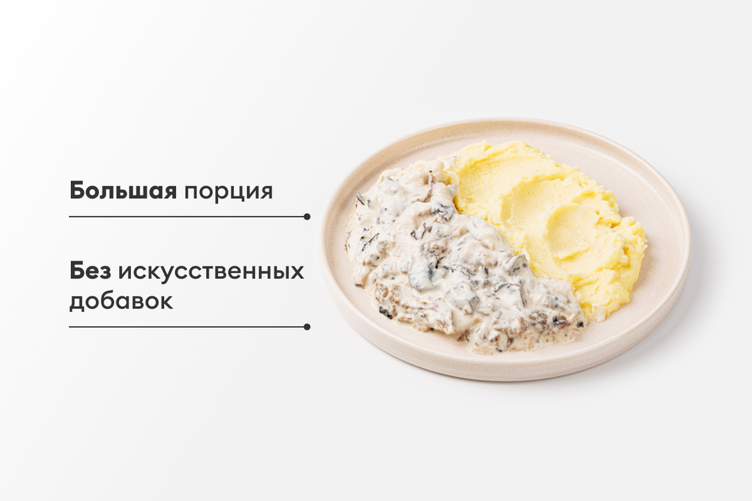 Большая порция мяса с картофельным пюре. Состав проверен: нет усилителей вкуса, консервантов и антибиотиков