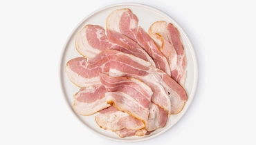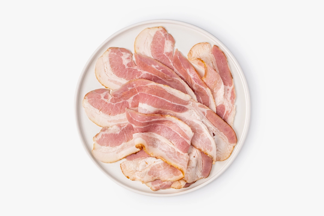 Тонкие ломтики сырокопчёной грудинки с насыщенным вкусом и ароматом дымка. Свинина томлёная, с характерными мясными прожилками, которые делают текстуру сочной и мягкой. Бекон традиционно используется для приготовления основных блюд, сытных завтраков и итальянской пасты
