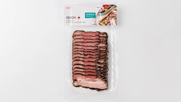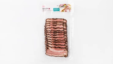 Продукт мясной из свинины копчено-запеченный категории Б. Мясистые ломтики копчёного бекона с тонкой корочкой пикантных пряностей. Его можно использовать как обычный бекон: добавлять в яичницы, бутерброды, пасты. Кроме того, продукт прекрасно подойдёт к мясной тарелке.