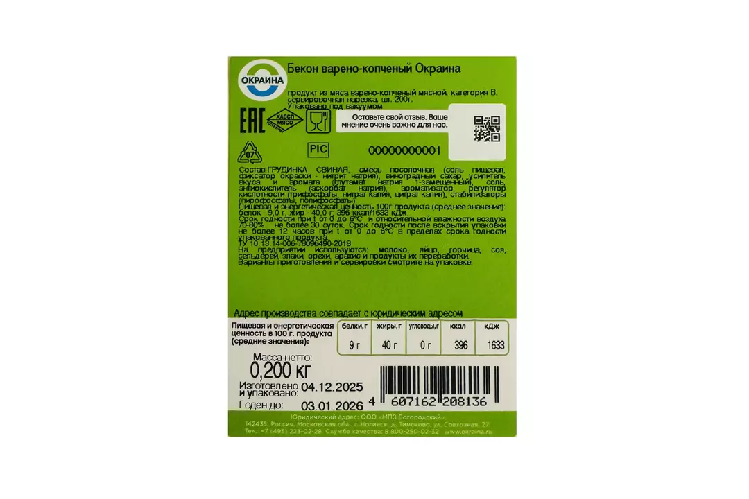 Бекон Окраина варено-копченый изготавливается из высококачественной охлажденной свиной грудинки. Благодаря копчению на натуральной буковой щепе он обладает умеренным запахом копчения и сбалансированным вкусом. Отличный баланс мясных и жировых прослоек позволит насладиться вам всеми прелестями замечательного бекона. Он прекрасно подходит и в качестве самостоятельной закуски, и для добавления в различные блюда: яичницу, пасты, салаты. Страна-производитель Россия
