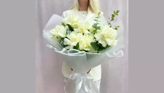Белоснежные французские розы – нежные и элегантные цветы, которые символизируют искреннюю любовь, верность и глубокое уважение. Букет из белых роз универсален и подойдет в качестве подарка на любое событие вне зависимости от повода или пола получателя. Состав Французская роза 7 шт. Лента атласная - 1 шт. Упаковка дизайнерская - 5 шт, Эвкалипт 3 шт
