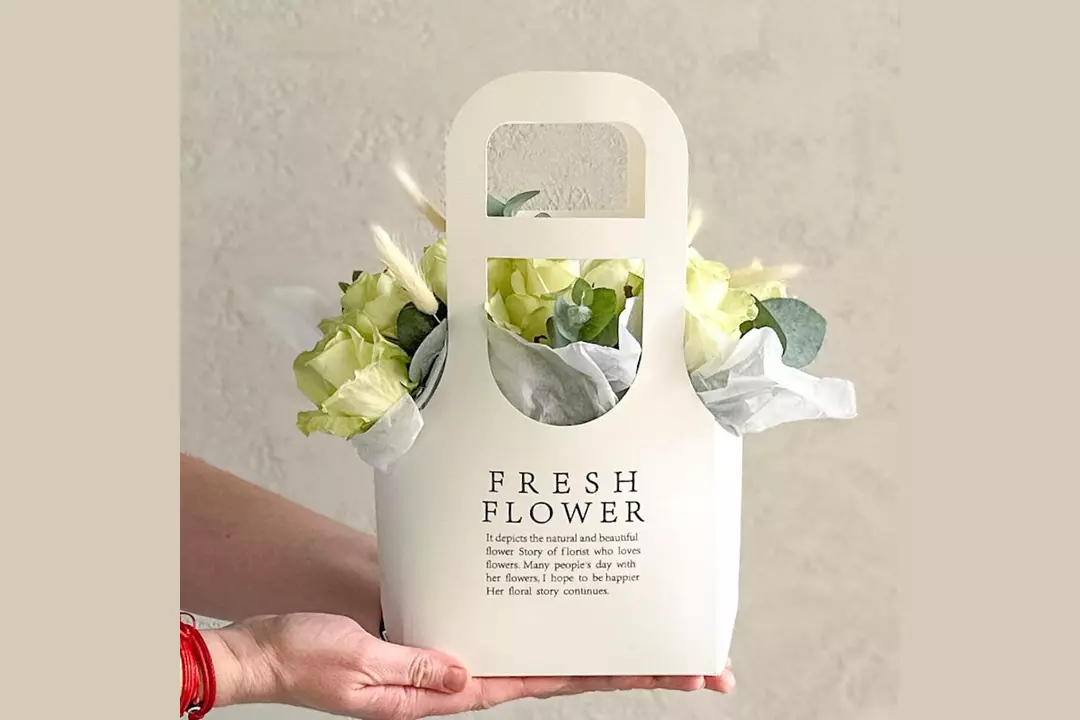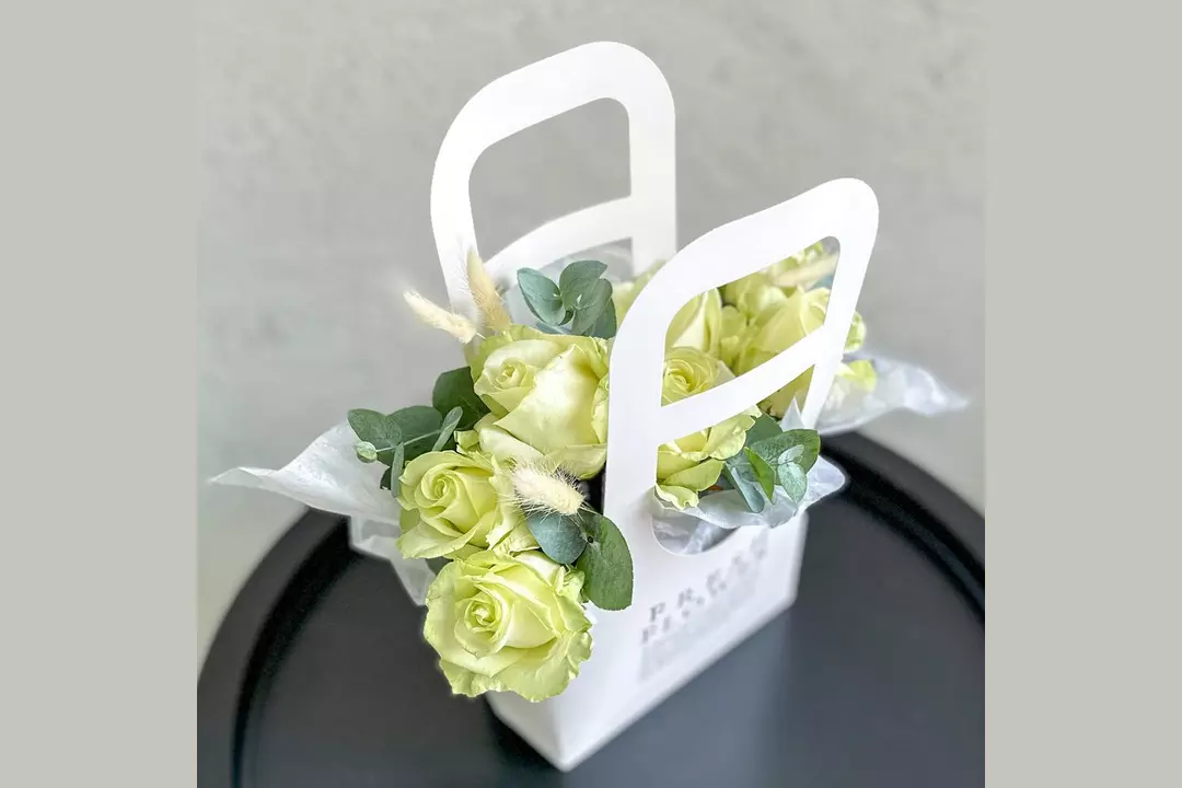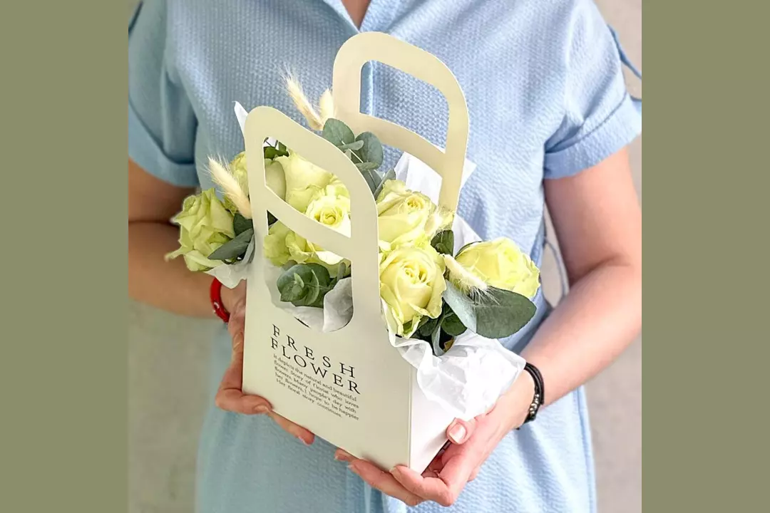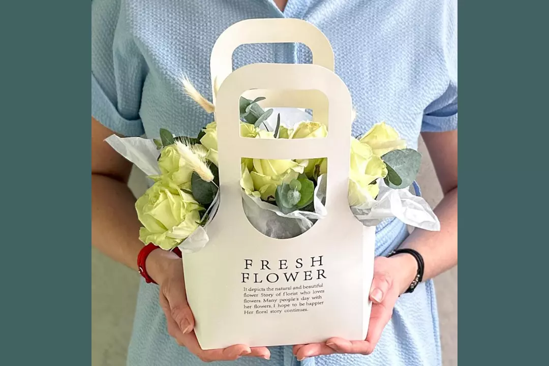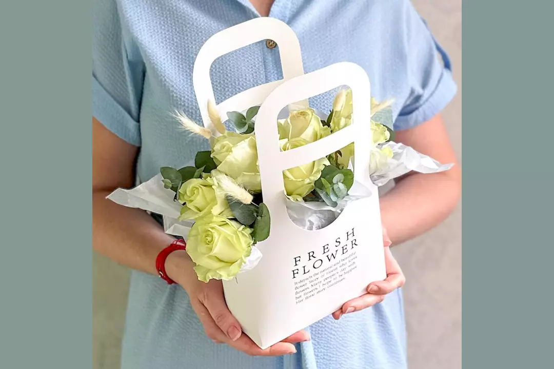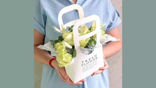 Белые розы с эвкалиптом в сумочке FMART by flowwow