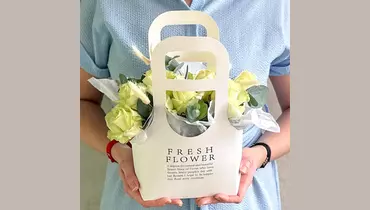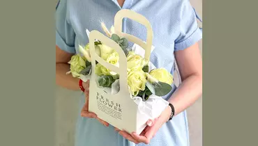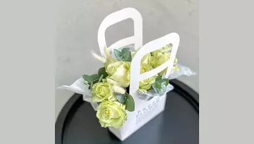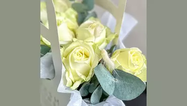 Состав Эвкалипт - 2 шт. Тишью - 1 шт. Роза Россия - 7 шт. Лагурус - 5 шт. Сумочка картонная - 1 шт. Губка флористическая - 1 шт.