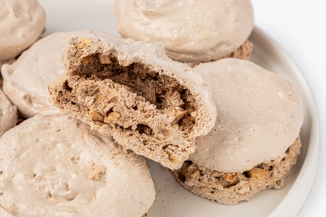 Воздушное безе с орехово-шоколадными нотами — это гармония контрастов: арахис приятно хрустит, белковая основа тает во рту, а какао оставляет тёплое послевкусие. Продукт не содержит ароматизаторы и искусственные добавки. Натуральное лакомство хорошо сочетается с молоком или какао. Его можно подать к травяному чаю как лёгкий десерт или взять с собой для перекуса.