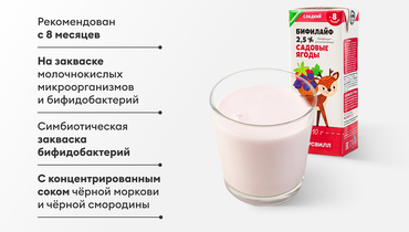 В нашем бифилайфе пониженное содержание сахара, пюре только из настоящих ягод малины и чёрной смородины, а также пять типов полезных бифидобактерий. Не добавляем ароматизаторов или усилителей вкуса