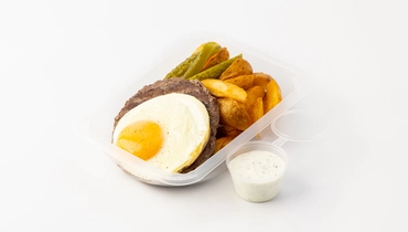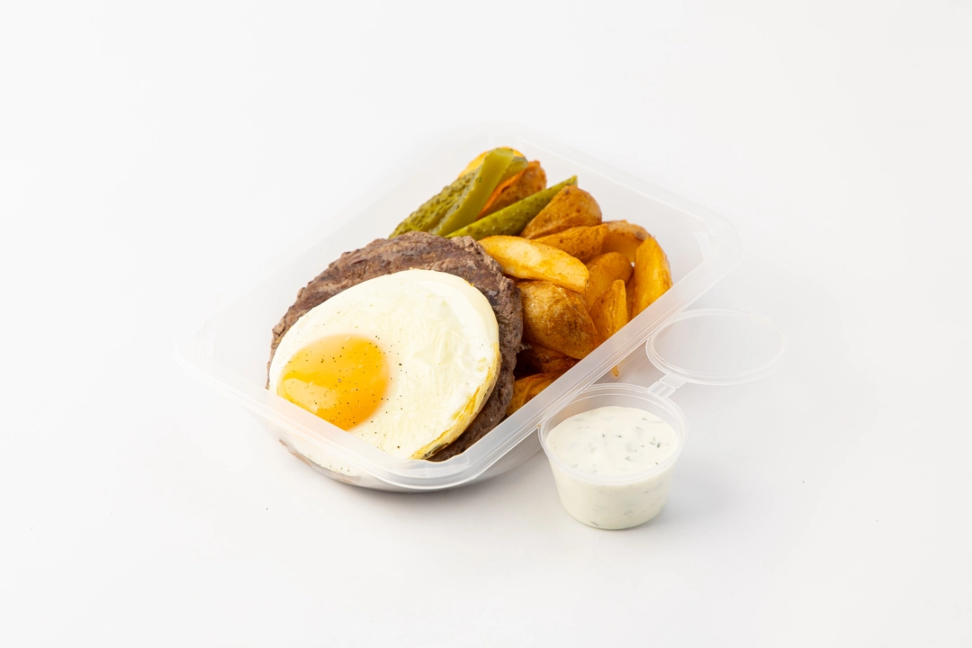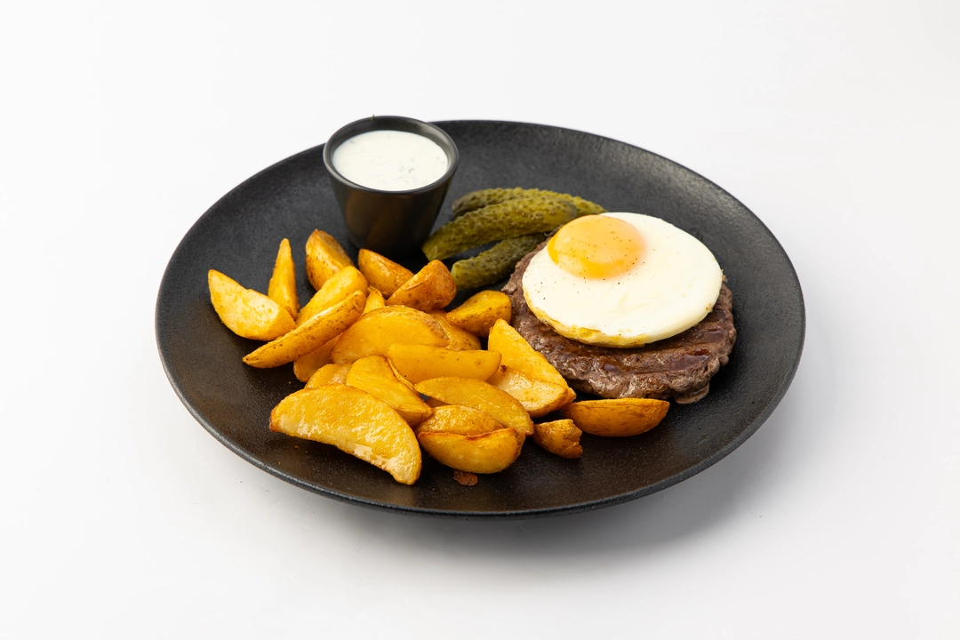 Готовое блюдо из говяжьего бифштекса с яйцом и картофельными дольками. Бифштекс приготовлен из рубленой говядины, подаётся с жареным яйцом. Картофельные дольки покрыты лёгкой пряной обсыпкой и остаются плотными внутри. Соус на основе бешамеля и чеснока добавляет мягкий сливочный акцент. Блюдо доступно для самовывоза из магазинов с зоной кафе.