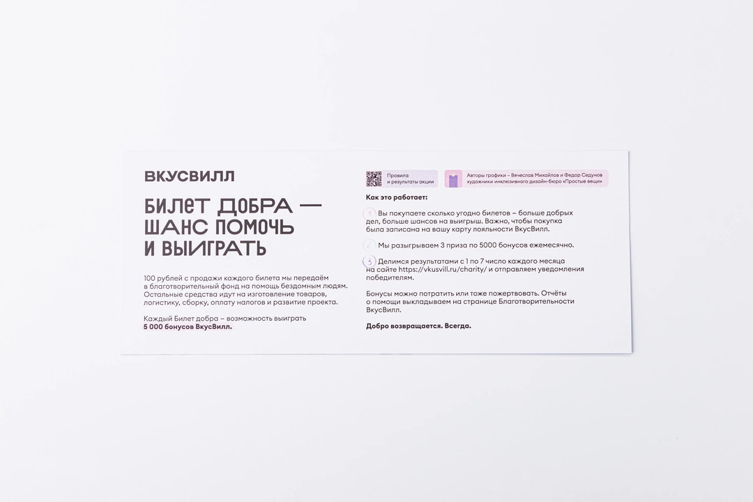 Билет добра для бездомных людей купить с бесплатной доставкой на дом всего за 2 часа из ВкусВилла. Также можно оформить онлайн-заявку на самовывоз и забрать собранный заказ через 30 минут. Цены, отзывы о товарах от наших покупателей, действующие акции на официальном сайте ВкусВилл.