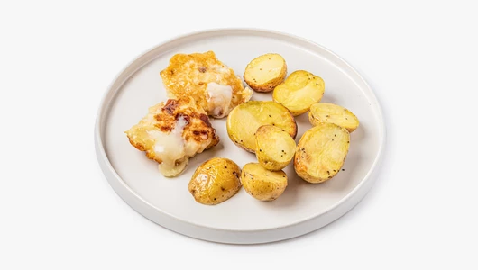 Бесподобно нежные биточки готовят из куриной грудки, добавляя много сыра. Гауда придаёт им сливочность и соблазнительно тянется, делая обед ещё аппетитнее. А мини-картофель запекают прямо в тоненькой кожуре — это делает вкус насыщенным, а текстуру рассыпчатой.