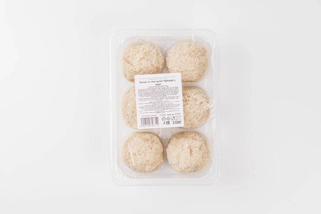 Биточки из мяса цыплят-бройлеров с нежным творожным сыром. Сливочный вкус и мягкая текстура, минимум специй — ничего лишнего, только натуральные ингредиенты. Дополнительно проверяем мясо на содержание 23 видов антибиотиков
