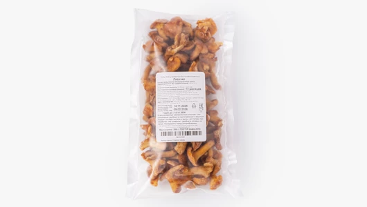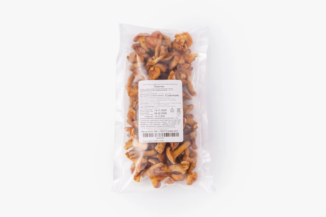 Целые лисички уже бланшированы, заморожены и удобны в готовке. Грибы не нужно мыть или чистить, их можно сразу отправить на сковороду или в кастрюлю. Предварительная обработка убрала природную горчинку, оставив нежный лесной вкус и упругую текстуру. Лисички хорошо подходят для жарки с картофелем, добавления в супы или сливочные соусы. Перед употреблением рекомендуем разморозить продукт.