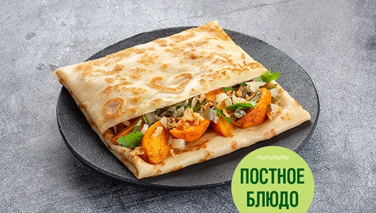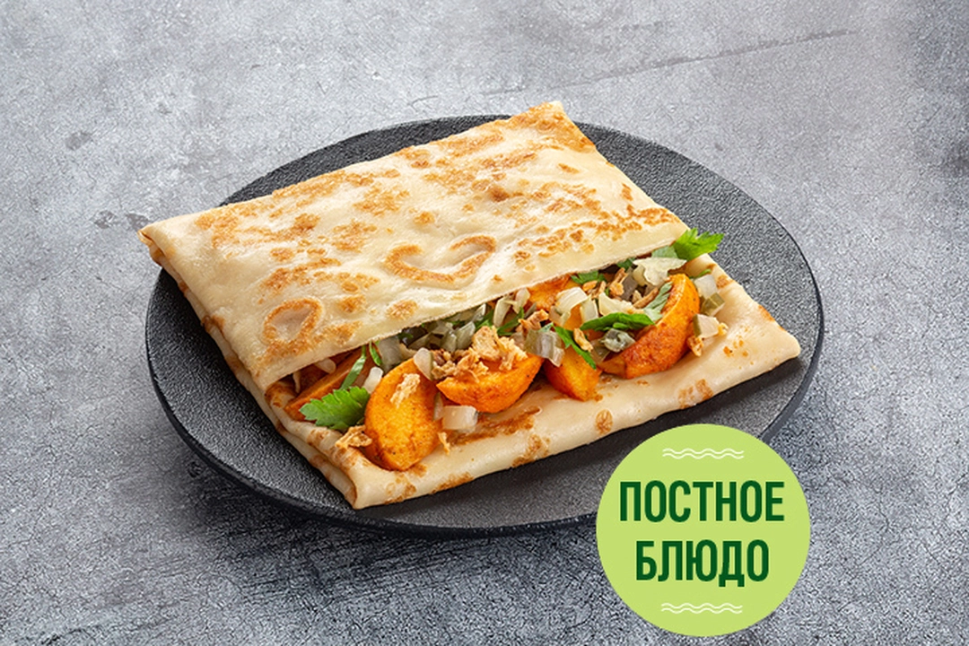 Блин из постного теста с картофелем, специями, огурцами маринованными, луком жареным, свежей петрушкой и подсолнечным маслом.