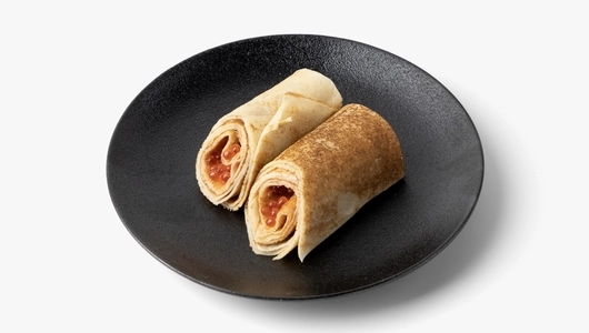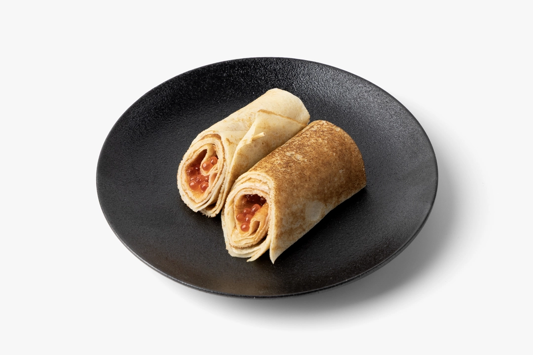 Яркие икринки горбуши контрастируют с мягкой текстурой тонкого теста. Блинчик приготовлен на молоке и остаётся мягким, не пересушенным, поэтому начинка распределяется равномерно и хорошо ощущается в каждом кусочке. Это блюдо всегда выглядит празднично и хорошо подходит и для особого повода, и для традиционного завтрака или перекуса. Доступно для самовывоза из магазинов с зоной кафе.